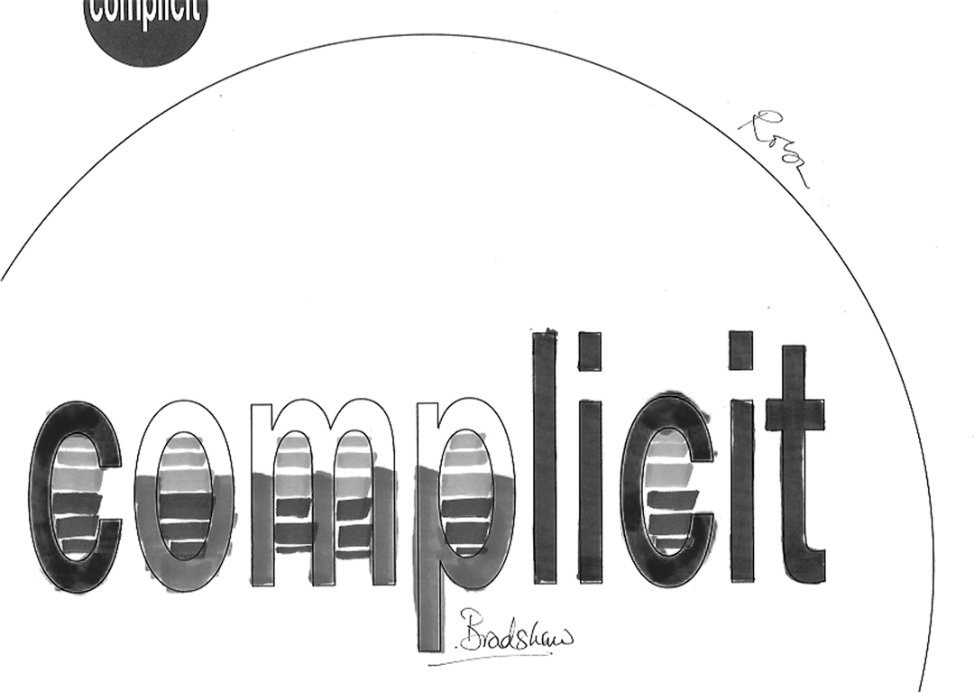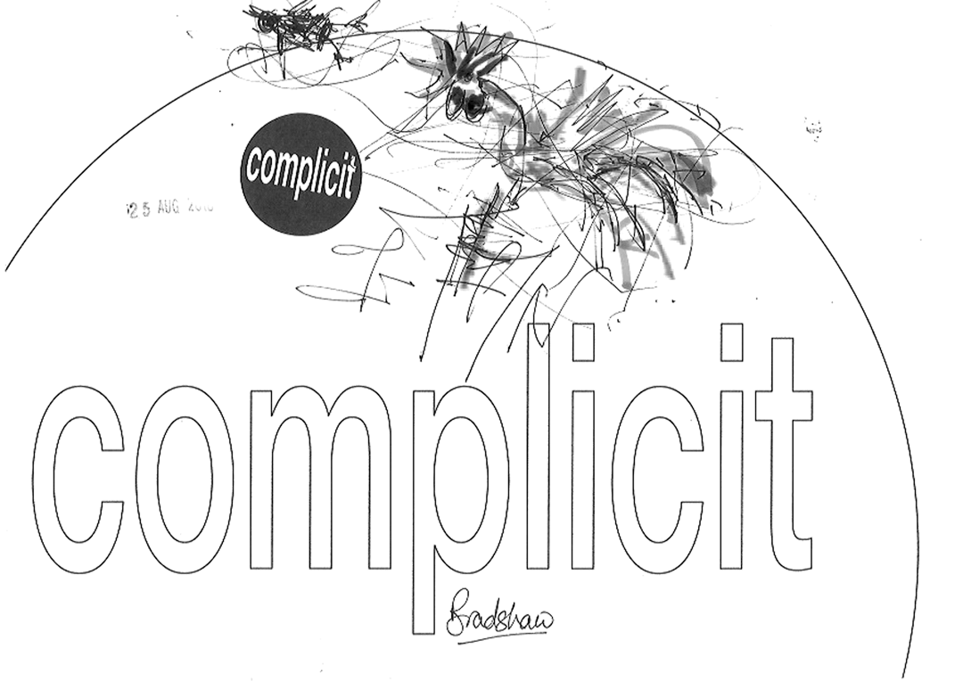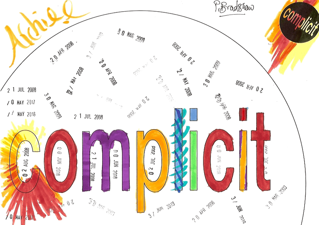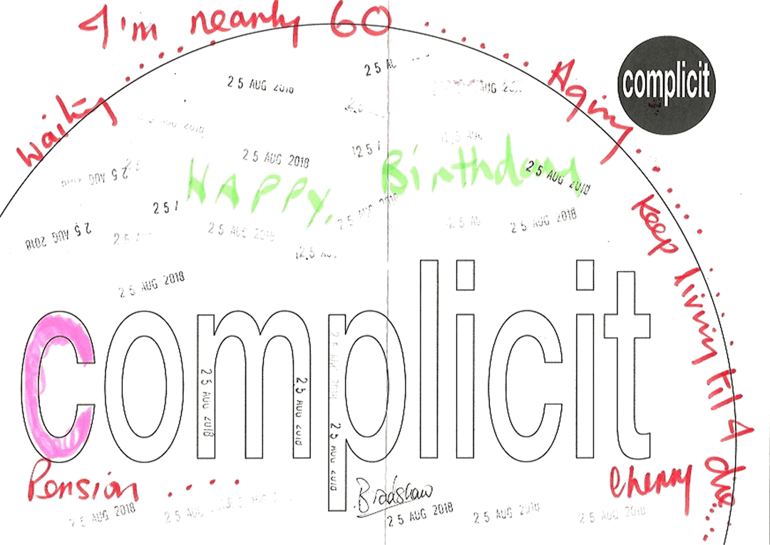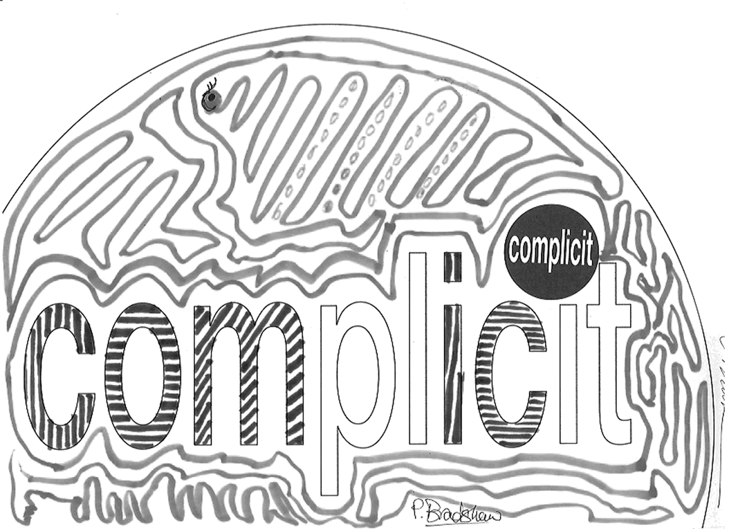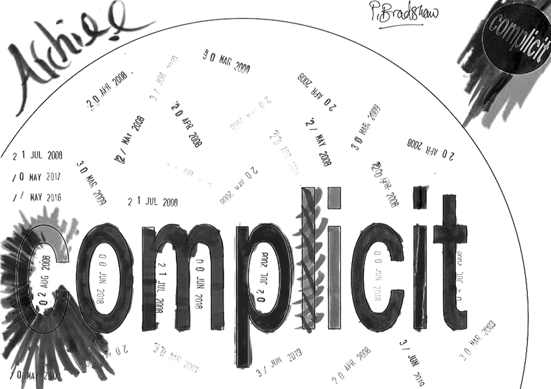 27 visitors participated in the event, each producing a jointly authored work with me. This piece takes all 27 of the 'complicit' works and a monochrome version of each and combines them in real time. To generate a combined image, it selects a random number of the works and merges them in a random sequence. It randomly chooses whether to include the full colour or the monochrome image. Then, a few seconds later, it does it all again - repeatedly, ad infinitum.