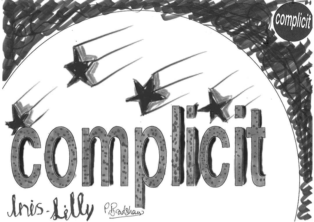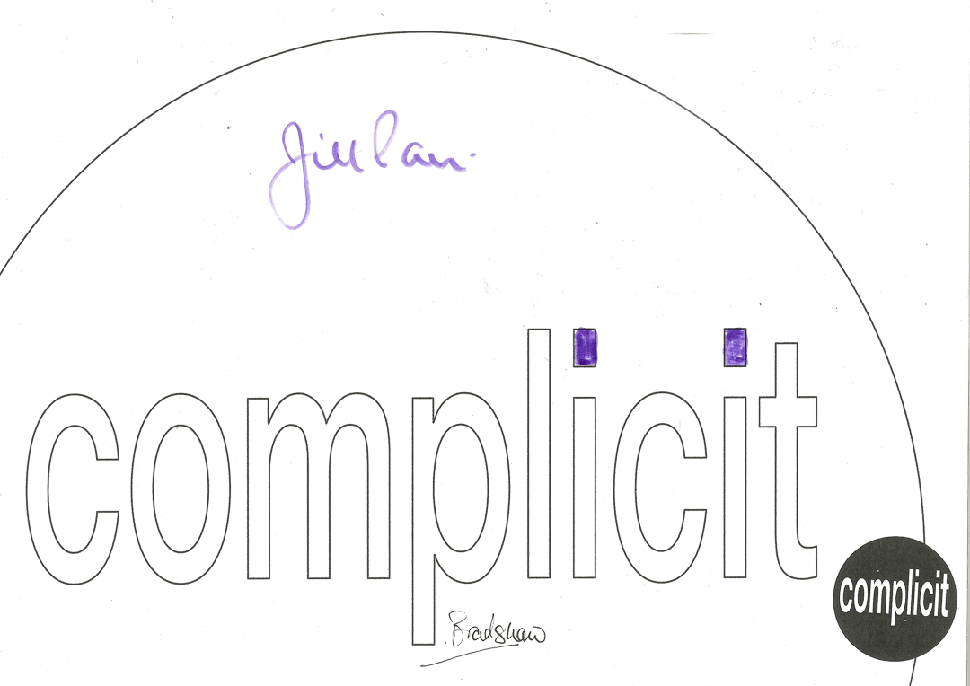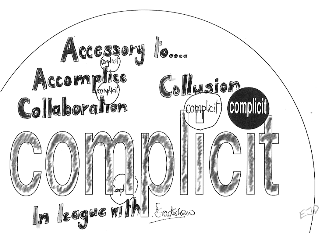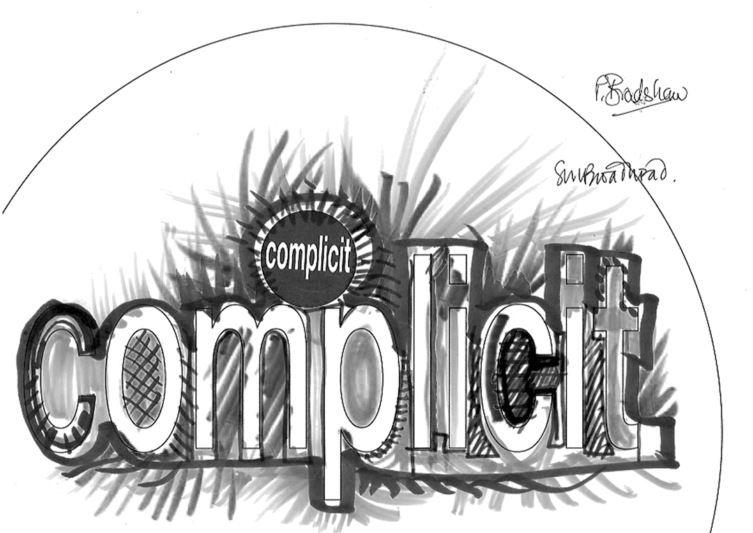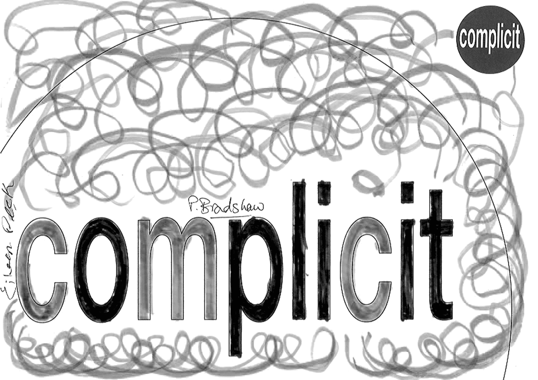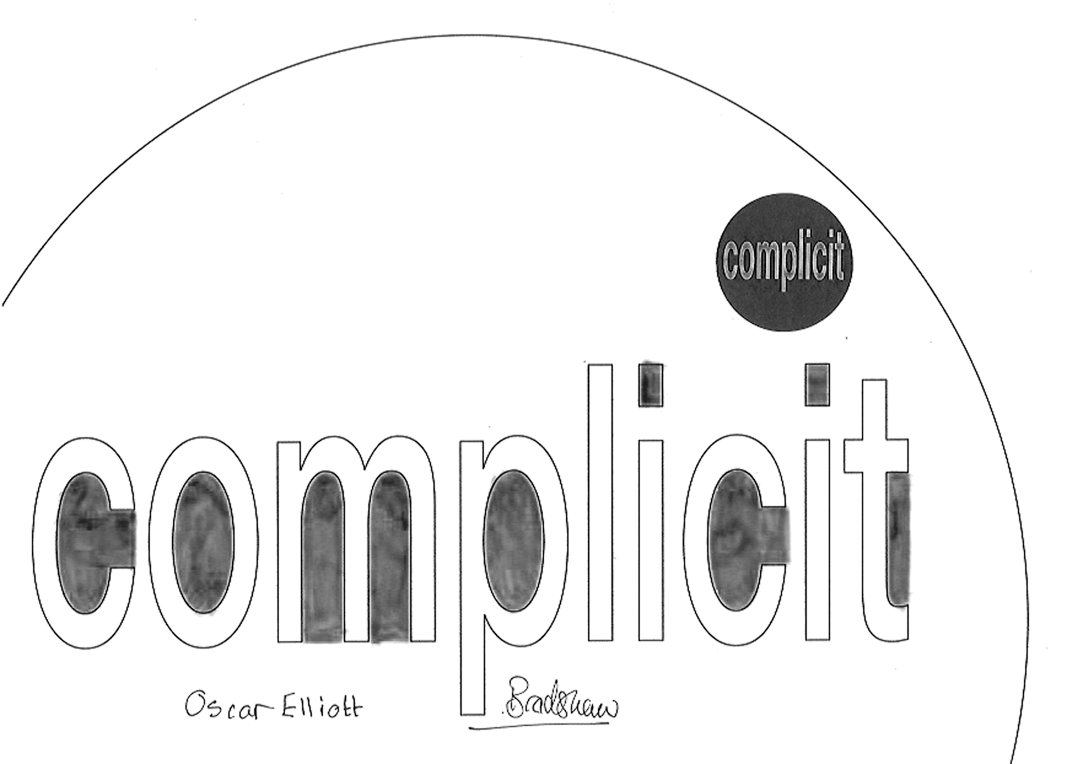 27 visitors participated in the event, each producing a jointly authored work with me. This piece takes all 27 of the 'complicit' works and a monochrome version of each and combines them in real time. To generate a combined image, it selects a random number of the works and merges them in a random sequence. It randomly chooses whether to include the full colour or the monochrome image. Then, a few seconds later, it does it all again - repeatedly, ad infinitum.