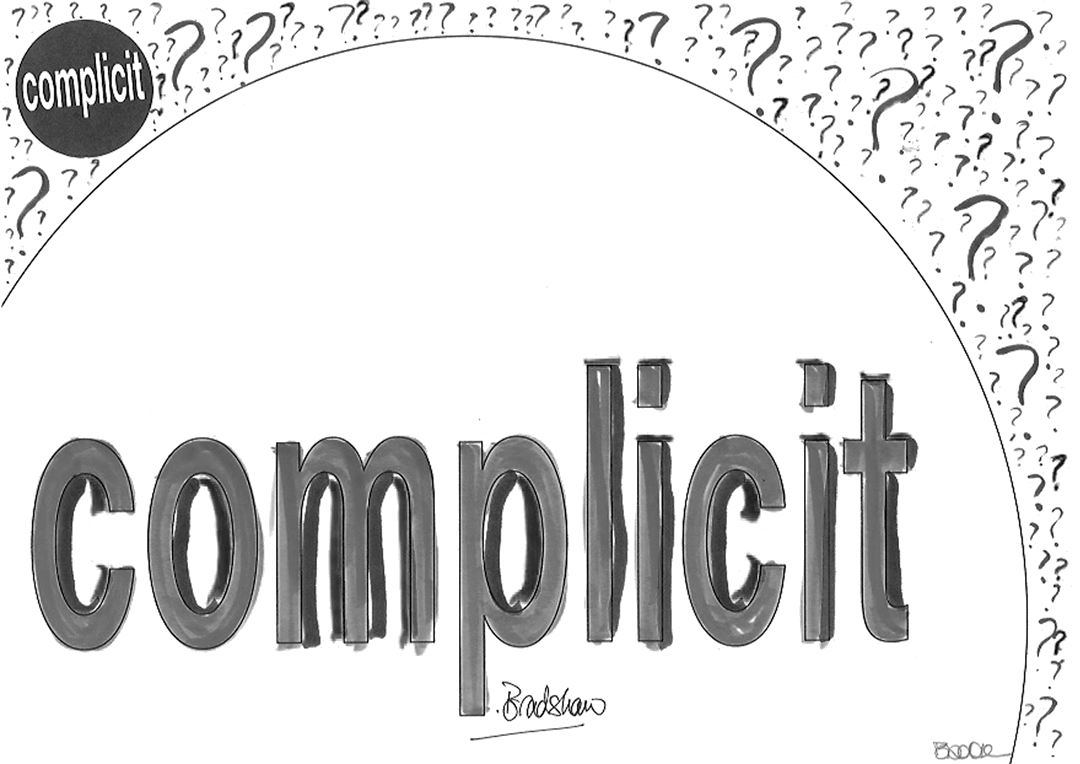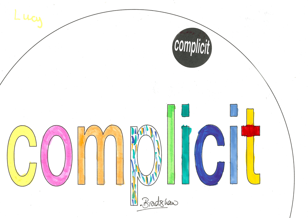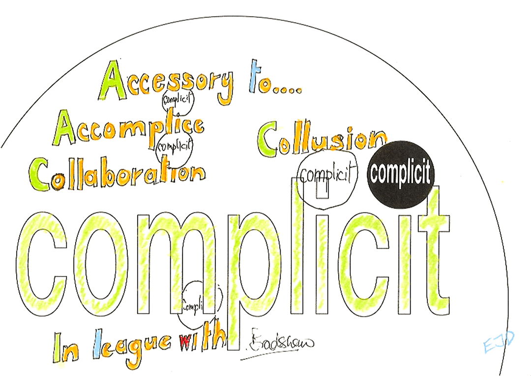 Click the down arrow (bottom right) to see more on 'complicit'.